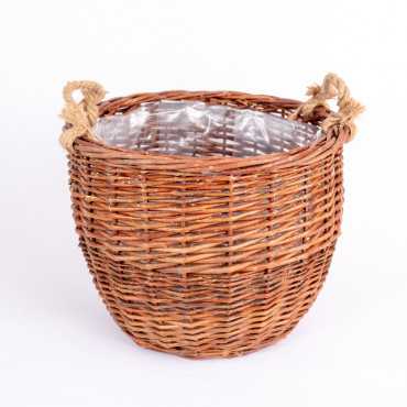 Kosz pleciony w kolorze brązowym z uchwytem. Wnętrze kosza wypełnione jest folią zabezpieczającą przed wodą i zabrudzeniem.