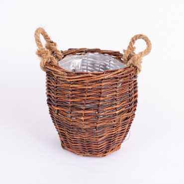 Kosz pleciony w kolorze brązowym z uchwytem. Wnętrze kosza wypełnione jest folią zabezpieczającą przed wodą i zabrudzeniem.