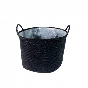 Okrągły kosz wyplatany z trawy morskiej w kolorze czarnym. W środku znajduje się folia zabezpieczająca przed wodą i zabrudzeniami.