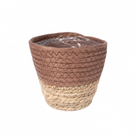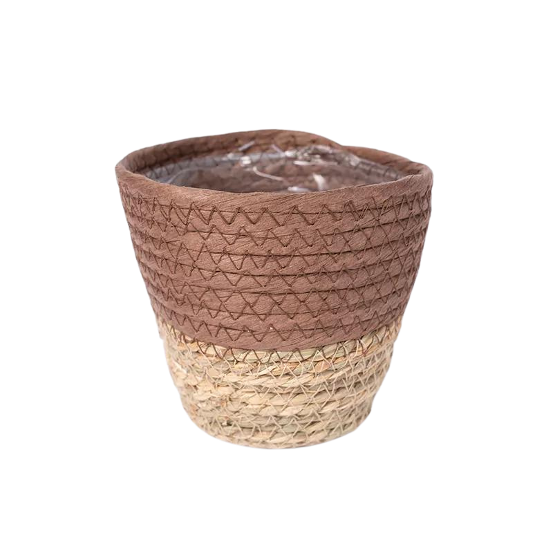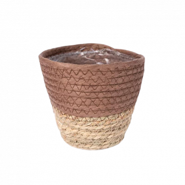 Kosz wyplatany z liści kukurydzy zabarwiony na kolor brązowy. Wnętrze kosza wypełnione jest folią zabezpieczającą przed wodą i zabrudzeniem