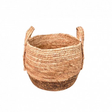 Kosz wyplatany w kolorze brązowym ze wstawką i uchwytami. W środku nie ma folii zabezpieczającej przed wodą i wilgocią, dlatego najlepiej umieścić roślinę wraz z podstawką