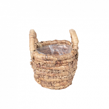 Kosz wyplatany z hiacyntu wodnego w kolorze naturalnym z uchwytem. Od środka zastosowano folię, by nadmiar wody nie wydostawał się na zewnątrz pojemnika. Podany rozmiar pasuje do rośliny w doniczce produkcyjnej o średnicy 12 - 14 cm.