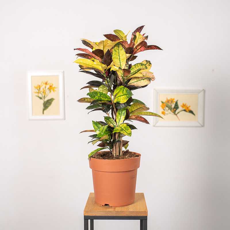 Kroton Iceton to oszałamiająco piękna roślina o fantastycznym kolorze i różnorodności liści. Liście są błyszczące i mają spiczaste końcówki, a każdy z nich ma żywe plamy czerwieni, różu, żółci lub pomarańczy. Bardzo ozdobny, można go uznać za dzieło sztuki ogrodnictwa. Codiaeum Iceton zdecydowanie przyciąga wzrok.