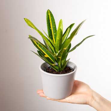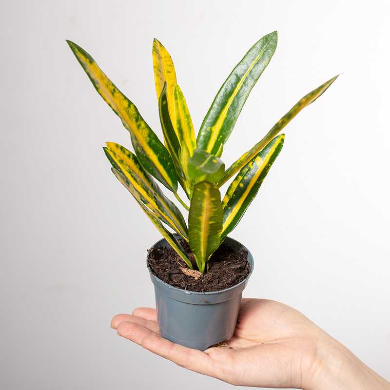 'Sunny Star' to odmiana krotona z wydłużonymi, zielonymi liśćmi ozdobionymi żółtymi kropkami i wyraźnie zaznaczonym nerwem głównym. Ta roślina z pewnością ożywi każde wnętrze.