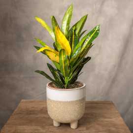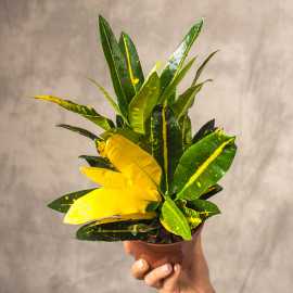'Sunny Star' to odmiana krotona z wydłużonymi, zielonymi liśćmi ozdobionymi żółtymi kropkami i wyraźnie zaznaczonym nerwem głównym. Ta roślina z pewnością ożywi każde wnętrze.