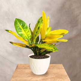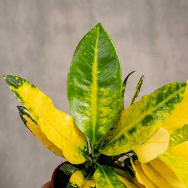 'Sunny Star' to odmiana krotona z wydłużonymi, zielonymi liśćmi ozdobionymi żółtymi kropkami i wyraźnie zaznaczonym nerwem głównym. Ta roślina z pewnością ożywi każde wnętrze.