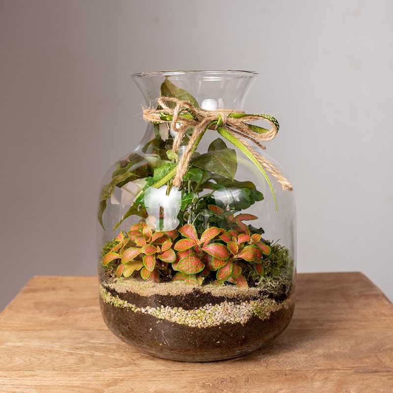 Mix kilku wybranych roślin w dużym, szklanym słoju. To bardzo efektowna i łatwa w utrzymaniu kompozycja. Idealna na zbliżający się Dzień Matki. W okresie letnim rośliny należy podlewać raz na tydzień niewielką ilością wody, w chłodniejsze miesiące roku wystarczy raz na 2 tygodnie. Kompozycja powinna stać w miejscu jasnym, do którego nie docierają bezpośrednie promienie słoneczne.