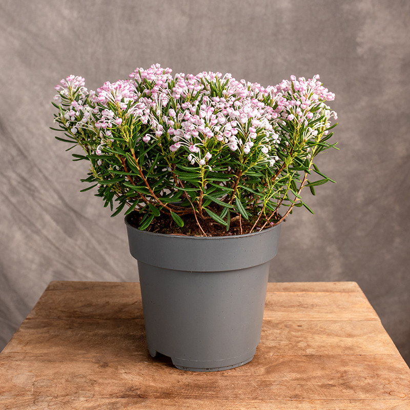 Modrzewnica pospolita 'Compacta' to niska, zimozielona krzewinka o zwartym, kulistym pokroju, idealna do ogrodów. Osiąga zaledwie 20–30 cm wysokości i rozrasta się powoli, tworząc gęste, dekoracyjne kępy. Wiosną zachwyca drobnymi, dzwonkowatymi kwiatami w odcieniu jasnoróżowym, zebranymi w zwisające grona. Kwiaty pojawiają się na tle wąskich, skórzastych, ciemnozielonych liści, które pozostają ozdobne przez cały rok. Roślina najlepiej rośnie w kwaśnym, wilgotnym, przepuszczalnym podłożu i półcienistym stanowisku. Doskonale sprawdza się w towarzystwie wrzosów, wrzośców, borówek i innych roślin kwasolubnych. Jest odporna na mrozy, choć w bezśnieżne zimy młodsze okazy warto lekko zabezpieczyć.