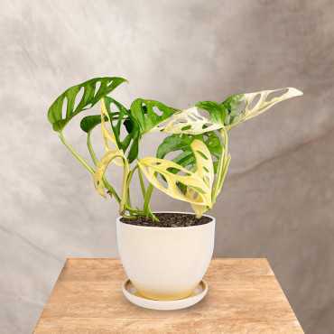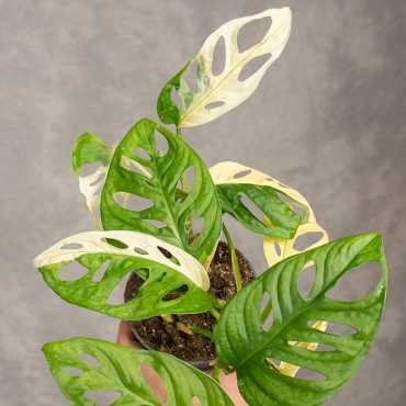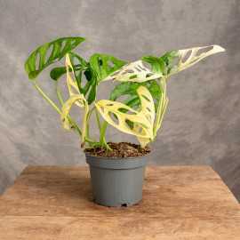 Monstera adansonii 'Variegata' to spektakularna, bardzo pożądana roślina doniczkowa o charakterystycznych, dziurkowanych liściach z kremową wariegacją. Każdy liść jest niepowtarzalny. Pochodzi z tropikalnych lasów Ameryki Środkowej. Wymaga wysokiej wilgotności. Ze względu na rzadkie wybarwienie jest bardzo ceniona wśród kolekcjonerów roślin.