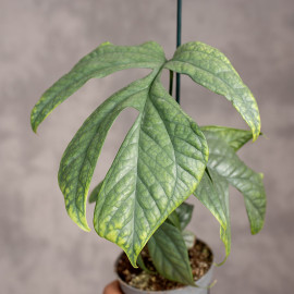 Monstera (Amydrium) ‘Medium Silver’ to niezwykle oryginalna i kolekcjonerska roślina pnąca, ceniona za swoje wyjątkowe, srebrzysto-zielone liście z wyraźnym, marmurkowym wzorem. Jej liście są mniejsze i delikatniejsze niż u klasycznej monstery, ale zachwycają metalicznym połyskiem i eleganckim wybarwieniem. Lubi jasne, rozproszone światło, wysoką wilgotność powietrza i lekkie, przepuszczalne podłoże.