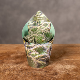 Opuntia tuna 'Crestata' to niezwykle efektowna, kolekcjonerska forma opuncji o charakterystycznym, falistym i wachlarzowym wzroście. Grzebieniaste pędy tworzą rzeźbiarską sylwetkę, dzięki czemu każda roślina wygląda jak naturalne dzieło sztuki. Zielone segmenty mogą być pokryte drobnymi glochidami, typowymi dla opuncji.