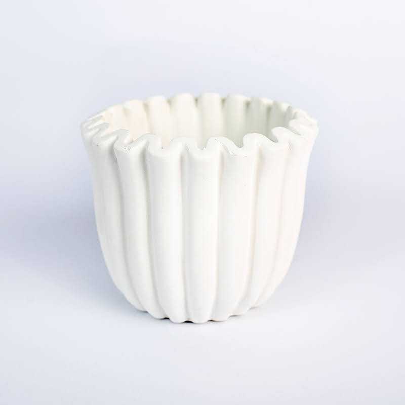 Osłonka betonowa z falistym wzorem w białym kolorze. Nie posiada otworu, dlatego przy przesadzeniu roślin należy pamiętać o warstwie drenażowej np. keramzyt bądź umieścić roślinę w doniczce produkcyjnej.
