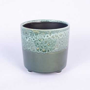 Osłonka ceramiczna na nóżkach w kolorze ciemnej zieleni z fakturą. Nie posiada otworu, dlatego przy przesadzaniu roślin należy pamiętać o warstwie drenażowej np. keramzyt bądź umieścić roślinę w doniczce produkcyjnej.