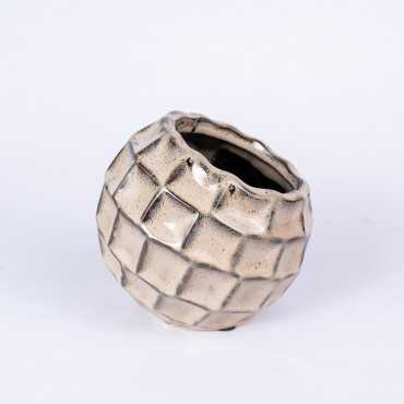 Osłonka ceramiczna w kształcie kuli ściętej pod skosem w kolorze brązowo-beżowym ze wzorem. Może służyć jako osłonka do roślin jaki i pojemnik do przechowywania przedmiotów.