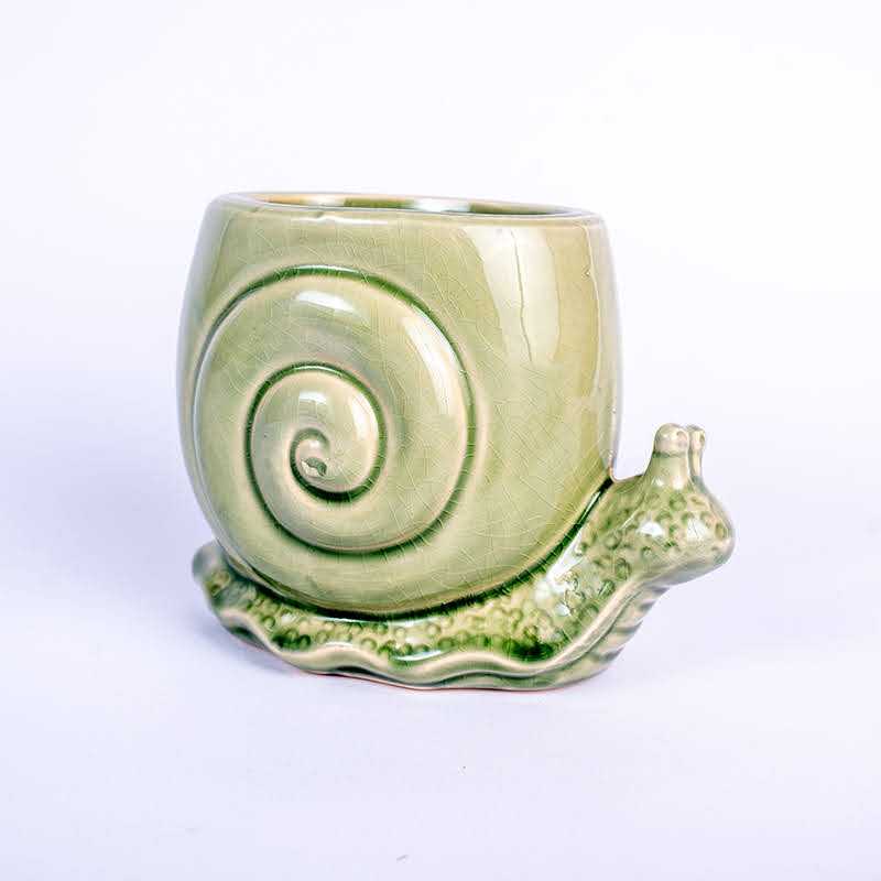 Osłonka ceramiczna w widocznym kształcie ślimaka w kolorze zielonym. Nie posiada otworu, dlatego przy przesadzeniu roślin należy pamiętać o warstwie drenażowej np. keramzyt bądź umieścić roślinę w doniczce produkcyjnej.