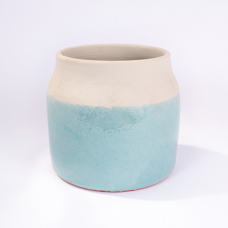 Osłonka 'Lisboa' posiada glinianą strukturę. Błękitna dolna warstwa jest lakierowana.
