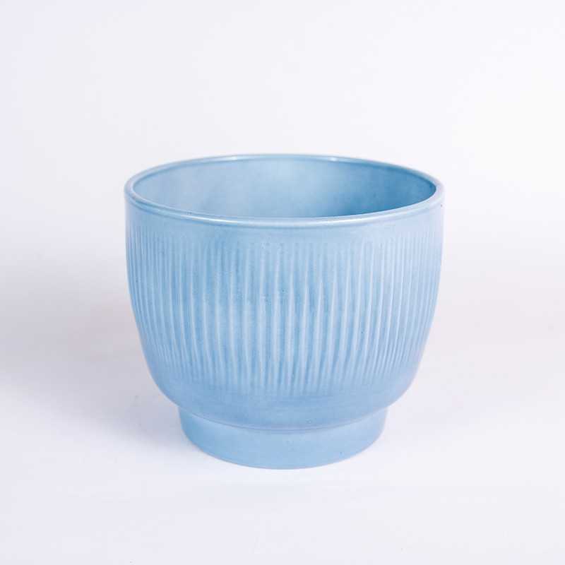 Osłonka do roślin w odcieniu niebieskiego lazuru z wytłaczanymi ozdobnymi paskami. Nie posiada otworu, dlatego należy pamiętać żeby umieścić roślinę w doniczce produkcyjnej.
