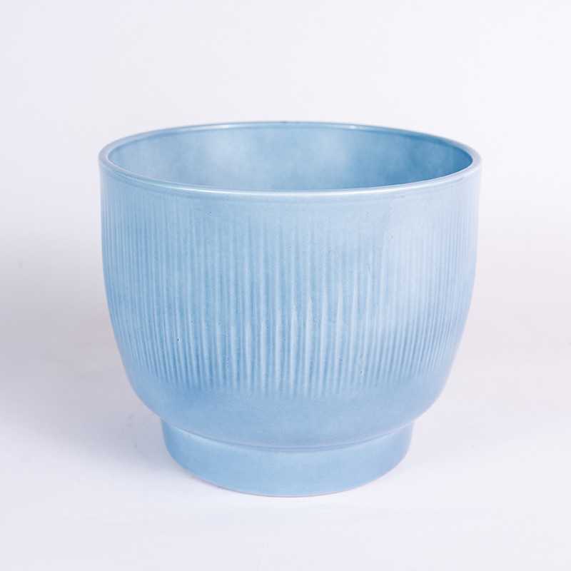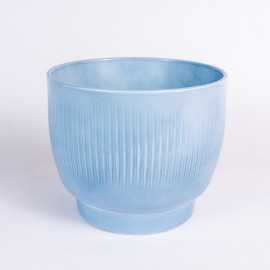 Osłonka do roślin w odcieniu niebieskiego lazuru z wytłaczanymi ozdobnymi paskami. Nie posiada otworu, dlatego należy pamiętać żeby umieścić roślinę w doniczce produkcyjnej.
