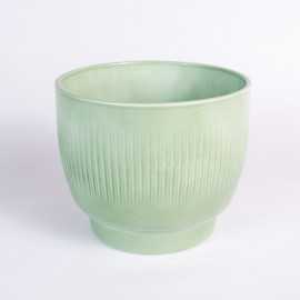 Osłonka do roślin w odcieniu zielonego lazuru z wytłaczanymi ozdobnymi paskami. Nie posiada otworu, dlatego należy pamiętać żeby umieścić roślinę w doniczce produkcyjnej.