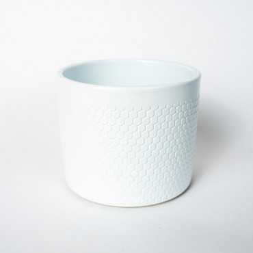Osłonka ceramiczna w kształcie walca z wytłaczanym wzorem plastra miodu w kolorze białym z połyskiem. Nie posiada otworu, dlatego przy przesadzeniu roślin należy pamiętać o warstwie drenażowej np. keramzyt bądź umieścić roślinę w doniczce produkcyjnej.