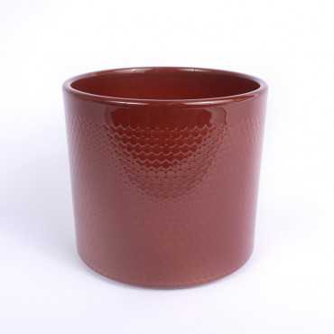 Osłonka ceramiczna w kształcie walca z wytłaczanym wzorem plastra miodu w kolorze lazurowego ciemnego kasztanu z połyskiem. Nie posiada otworu, dlatego przy przesadzeniu roślin należy pamiętać o warstwie drenażowej np. keramzyt bądź umieścić roślinę w doniczce produkcyjnej.