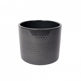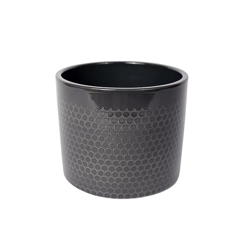 Osłonka ceramiczna w kształcie walca z wytłaczanym wzorem plastra miodu w kolorze granitowym z połyskiem. Nie posiada otworu, dlatego przy przesadzeniu roślin należy pamiętać o warstwie drenażowej np. keramzyt bądź umieścić roślinę w doniczce produkcyjnej.