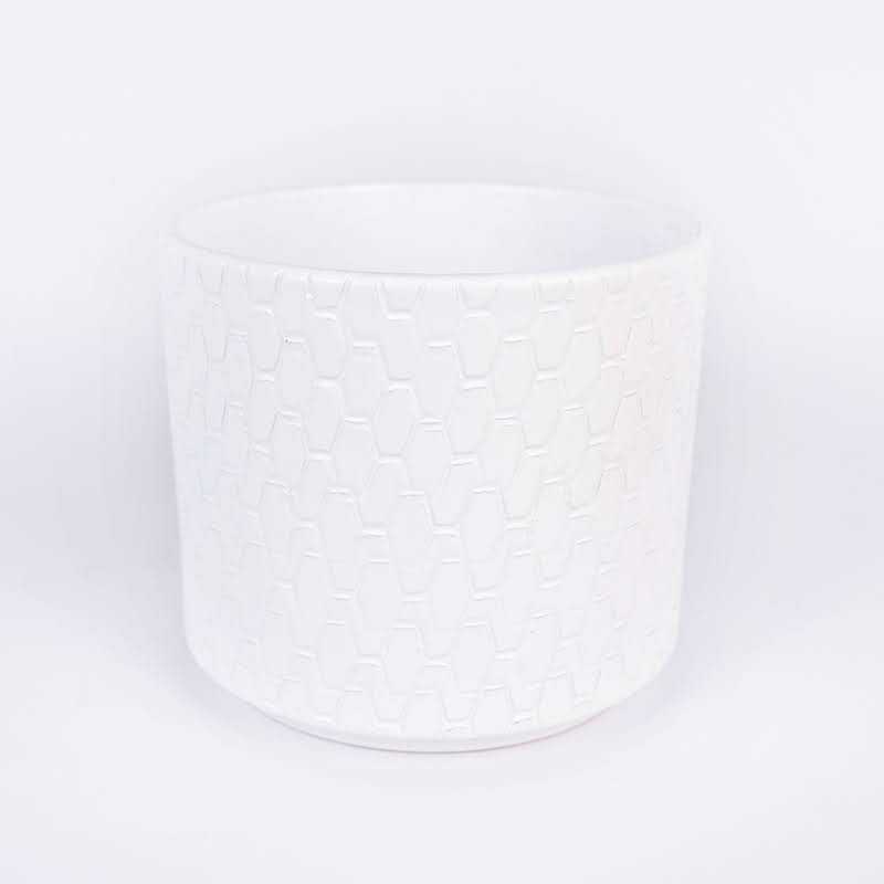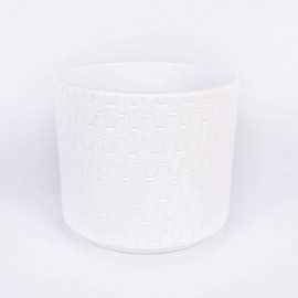 Osłonka ceramiczna w kształcie walca z wytłaczanym wzorem sześcianów w kolorze białym z matowym wykończeniem. Nie posiada otworu, dlatego przy przesadzeniu roślin należy pamiętać o warstwie drenażowej np. keramzyt bądź umieścić roślinę w doniczce produkcyjnej.