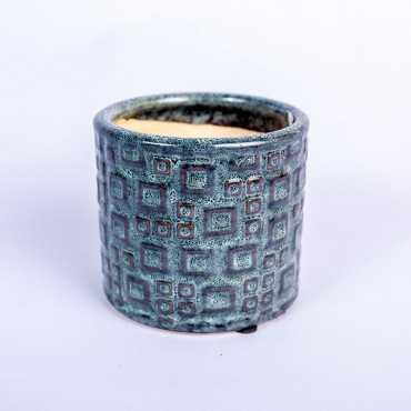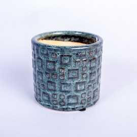 Osłonka ceramiczna w kształcie walca w niebieskim kolorze z wytłaczanym kwadratowym wzorem w brązowym odcieniu. Nie posiada otworu, dlatego przy przesadzeniu roślin należy pamiętać o warstwie drenażowej np. keramzyt bądź umieścić roślinę w doniczce produkcyjnej.