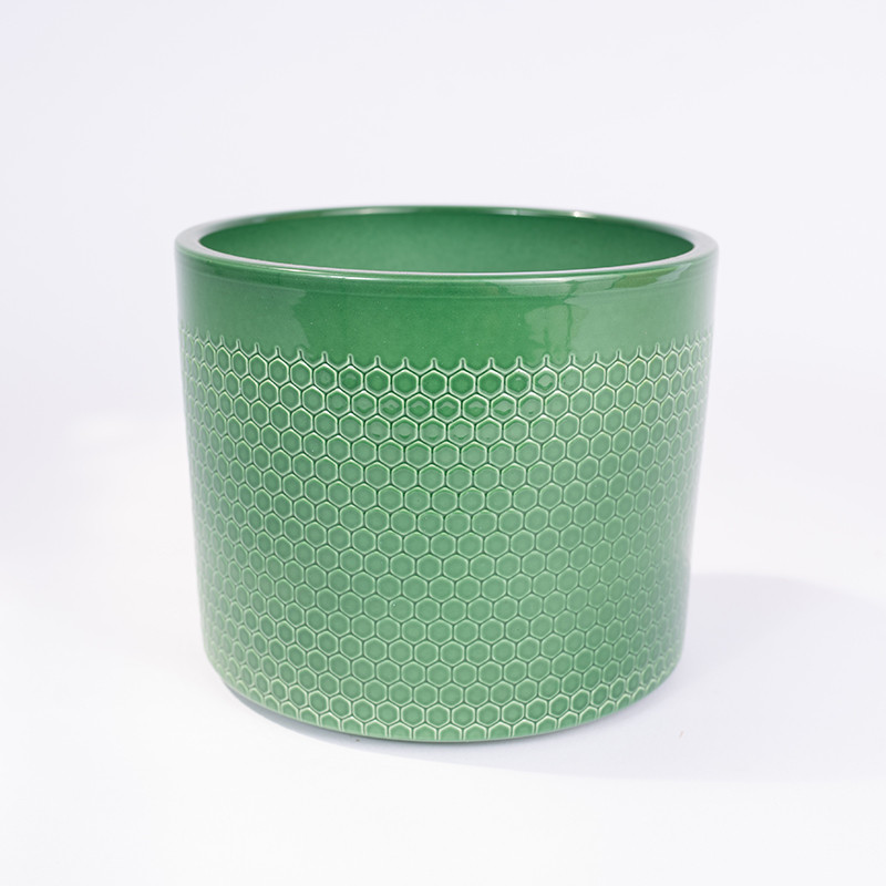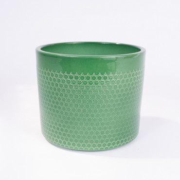 Osłonka ceramiczna w kształcie walca z wytłaczanym wzorem plastra miodu w kolorze zielonego lazuru z połyskiem. Nie posiada otworu, dlatego przy przesadzeniu roślin należy pamiętać o warstwie drenażowej np. keramzyt bądź umieścić roślinę w doniczce produkcyjnej.