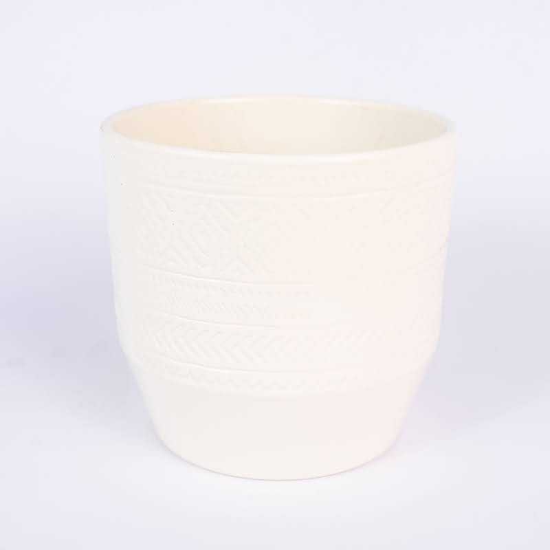 Osłonka ceramiczna z dekoracyjnymi wzorami w kolorze kremowym z połyskiem. Nie posiada otworu, dlatego przy przesadzeniu roślin należy pamiętać o warstwie drenażowej np. keramzyt bądź umieścić roślinę w doniczce produkcyjnej.