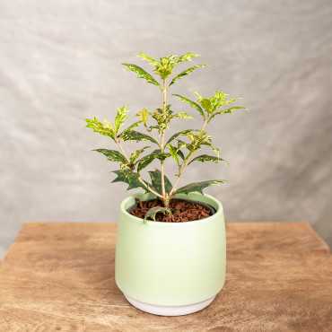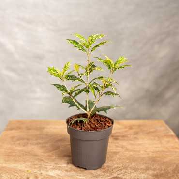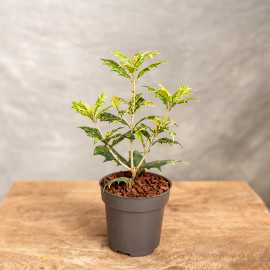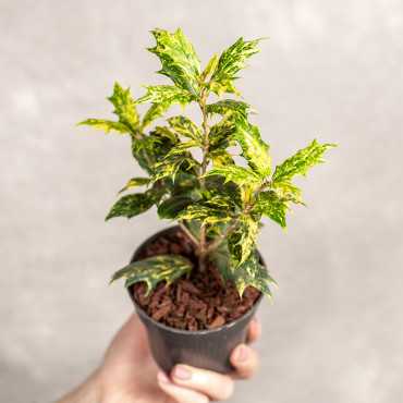Zimozielony krzew dorastający do 1,5-2 m wysokości. Ma skórzaste, ząbkowane liście (podobne do ostrokrzewu) z kremowo-żółtymi, nieregularnymi wzorkami. Nie jest w pełni mrozoodporny- wymaga okrycia na zimę.