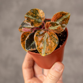 Peperomia ‘Crème Brûlée’ to urocza, kompaktowa roślina doniczkowa wyróżniająca się dekoracyjnymi liśćmi w odcieniach zieleni, kremu i delikatnych, ciepłych tonów. Jej subtelne wybarwienie i niewielkie rozmiary sprawiają, że doskonale nadaje się na biurko, półkę czy parapet. Najlepiej rośnie w jasnym miejscu z rozproszonym światłem, które pomaga utrzymać kontrastowe wybarwienie liści. Preferuje umiarkowane podlewanie - przed kolejnym podlaniem podłoże powinno lekko przeschnąć. Dzięki mięsistym liściom dobrze znosi krótkie przerwy w podlewaniu.