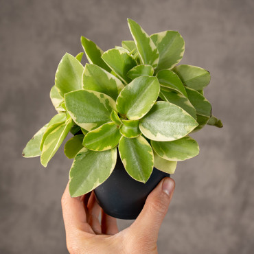 Peperomia 'Pixie Lime' Variegata to niezwykle dekoracyjna, kompaktowa odmiana o drobnych, mięsistych liściach w odcieniach soczystej zieleni, limonki i kremu. Jasna wariegacja nadaje jej świeżego, lekkiego charakteru i sprawia, że doskonale rozjaśnia wnętrza.