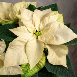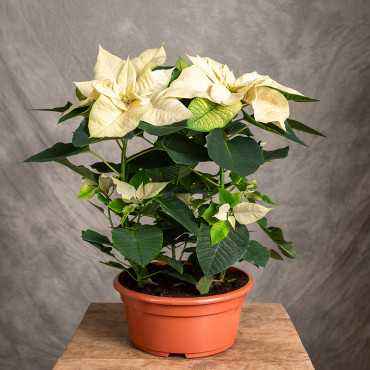 Poinsecja czyli Gwiazda Betlejemska to pozycja obowiązkowa na wigilijnym stole. Poinsecja naszej produkcji cechuje się najwyższą jakością, dużą trwałością i intensywnością kolorów. Prezentowana odmiana 'Allegra White' ma piękne kremowe przykwiatki.