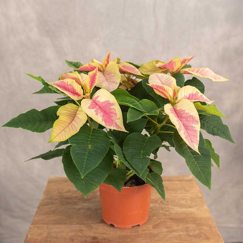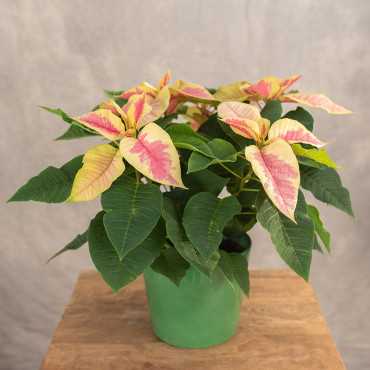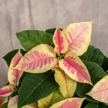 Odmiana poinsecji o oszałamiającej różowo - żółtej wariegacji.