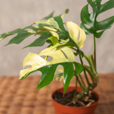 Rhaphidophora tetrasperma 'Variegata', często nazywana Mini Monsterą Variegata, to rzadka, kolekcjonerska roślina pnąca o szybkim tempie wzrostu, charakteryzująca się unikalną, nieregularną biało-kremową wariegacją na zielonych, głęboko wcinanych liściach. Jest łatwa w uprawie, idealna do mniejszych wnętrz, osiąga do 150 cm i najlepiej rośnie przy podporach.