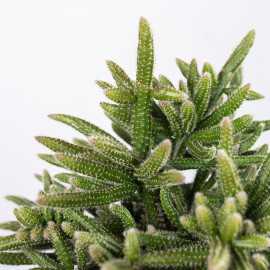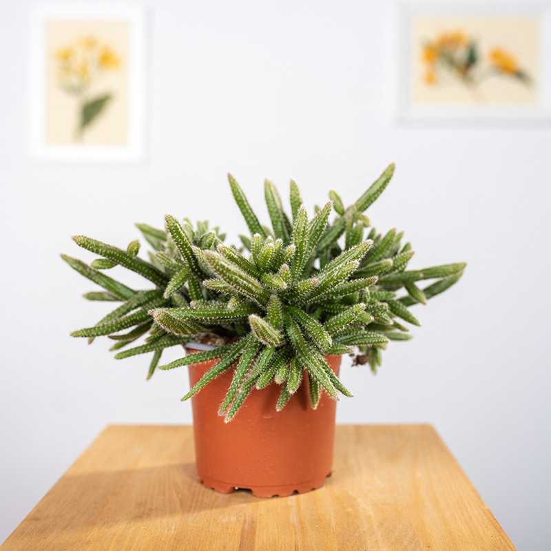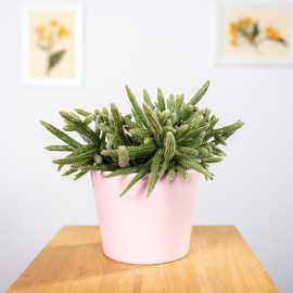 Rhipsalis 'Horrida' inaczej zwana mysimi ogonami. Ten sukulent potrafi tworzyć przewieszające się pędy o długości nawet 50 cm. Dzięki czemu świetnie sprawdzi się jako roślina prowadzona w donicy podwieszonej przy suficie lub prowadzona w dół z mebla.