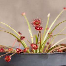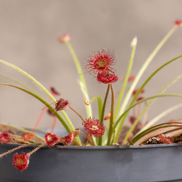 Drosera paradoxa to fascynująca roślina owadożerna pochodząca z Australii, należąca do rodzaju rosiczek. Charakteryzuje się długimi, wąskimi liśćmi pokrytymi lepkimi włoskami, które służą do wychwytywania i trawienia drobnych owadów. Roślina ta osiąga zwykle około 10–15 cm wysokości i tworzy zwartą rozetę. Drosera paradoxa preferuje jasne, słoneczne stanowiska oraz wilgotne, dobrze przepuszczalne podłoże o kwaśnym odczynie. Dzięki zdolności do łapania owadów jest nie tylko ciekawym okazem kolekcjonerskim, ale także naturalnym sposobem na kontrolę małych insektów w otoczeniu. Wymaga regularnego podlewania wodą destylowaną lub deszczową i wysokiej wilgotności powietrza.