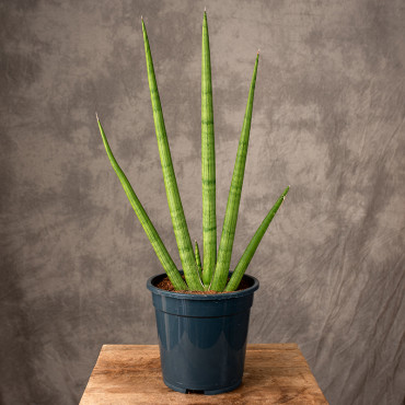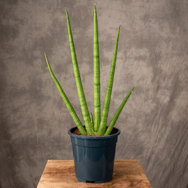 Sansewieria cylindryczna 'Handshake' to roślina o prostych, cylindrycznych liściach, które układają się w charakterystyczny wachlarzowy kształt. Dzięki swojej ciekawej formie świetnie sprawdzi się w nowoczesnych wnętrzach, na biurku, półce lub parapecie. Jest jedną z najbardziej wytrzymałych roślin doniczkowych – dobrze znosi przesuszenie, nie wymaga częstego podlewania i toleruje różne warunki oświetleniowe.