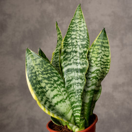 Sansewieria 'Futura Superba' charakteryzuję się krępym wzrostem charakterystycznym dla odmian nazywanych robustami i mocnymi żółtymi przebarwieniami wzdłuż liści.
