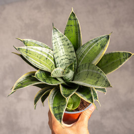 Sansewieria Hahnii ‘Silver Star’ to kompaktowa i niezwykle elegancka odmiana wężownicy, ceniona za swój unikalny, rozetowy pokrój. Jej liście są grube, sztywne i ułożone w zwartą rozetę, a ich powierzchnię zdobi efektowny wzór – naprzemienne pasy w odcieniach srebrzystej zieleni ze złotymi brzegami.