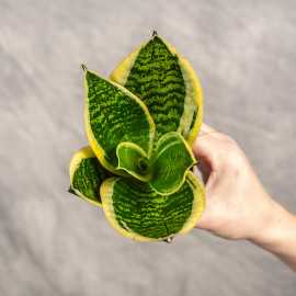 Kompaktowa odmiana sansewierii o szerokich, mięsistych liściach z charakterystycznym rysunkiem i żółtą obwódką. Tworzy zwartą rozetkę, gęsto ułożonych liści. Dorasta do ok. 15-30 cm.