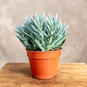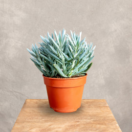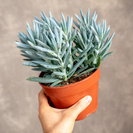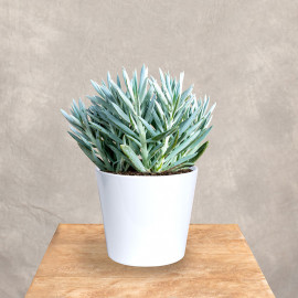 Senecio aquarine 'Mount Everest' to piękny pastelowy sukulent. Jego ciekawa barwa i forma pozwala mu dobrze komponować się z innymi roślinami. Trzeba przyznać, że ma wystarczająco uroku, żeby samemu zająć centralne miejsce. Uprawa Senecio aquarine jest bardzo prosta, najważniejsze żeby zapewnić mu dużo światła oraz pozwolić jego podłożu przeschnąć pomiędzy podlewaniami.