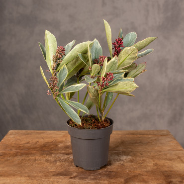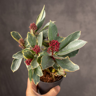 Skimia japońska 'Perosa' to elegancka, zimozielona odmiana o zwartym, harmonijnym pokroju. Wyróżnia się dekoracyjnymi, jasnoróżowymi pąkami kwiatowymi, które pojawiają się jesienią i pozostają ozdobą rośliny przez całą zimę. Wiosną rozwijają się w drobne, delikatnie pachnące kwiaty. Błyszczące, jasnozielone liście z kremową obwódką tworzą piękne tło dla pastelowych pąków, nadając roślinie subtelny i szlachetny wygląd.