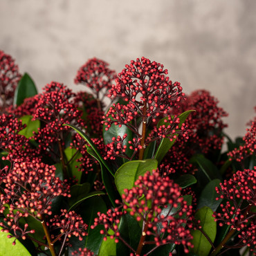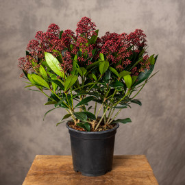Skimia japońska to zimozielony krzew, który ma skórzaste, ciemnozielone liście i bordowe kwiatostany, które w okresie wiosennym rozwijają się na biało-różowy kolor. Nie jest całkowicie mrozoodporna, dlatego uprawiana w pojemnikach powinna być przenoszona na zimę do chłodnego pomieszczenia.