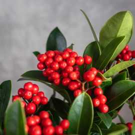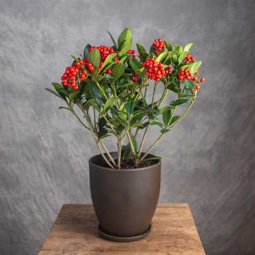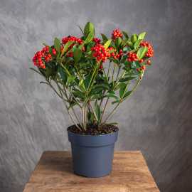 Skimia japońska to rodzaj dwupiennej rośliny z rodziny rutowatych (Rutaceae). W naturalnym środowisku występuje na obszarze Azji Wschodniej, gdzie osiąga nawet do 1,5 m wysokości. Nie jest mrozoodporna, dlatego w naszym klimacie uprawiana jest najczęściej jako roślina doniczkowa. Ma piękne, skórzaste, ciemno zielone liście i różowe kwiaty. W okresie jesieni pojawiają się kuliste, intensywnie czerwone owoce.