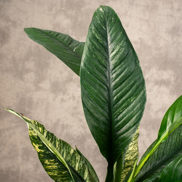 Spathiphyllum 'Sensation' Variegata to spektakularna, kolekcjonerska odmiana skrzydłokwiatu o bardzo dużych liściach z nieregularną, kremowo-białą wariegacją. Imponujące rozmiary i kontrastowe ubarwienie sprawiają, że roślina staje się wyrazistą ozdobą wnętrza i doskonale sprawdzi się jako soliter.