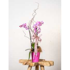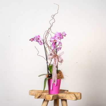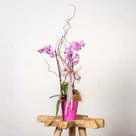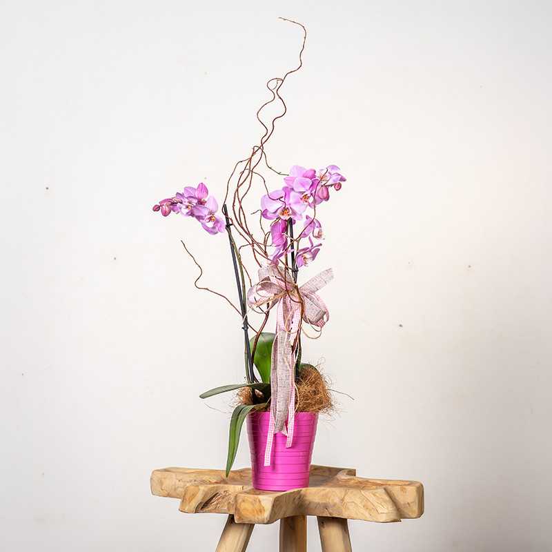 Storczyk 2-pędowy udekorowany przez florystę. Cena zawiera zestaw: roślina + osłonka + przybranie. Zdjęcie jest poglądowe, do kompozycji może zostać dobrany storczyk o innym, zbliżonym kolorze kwiatów.
