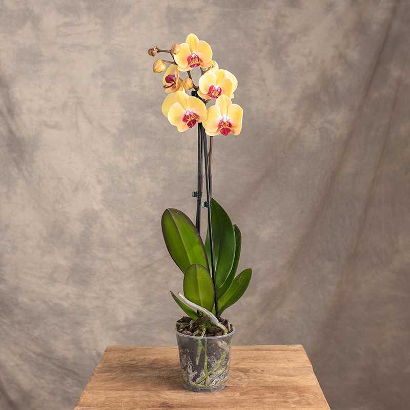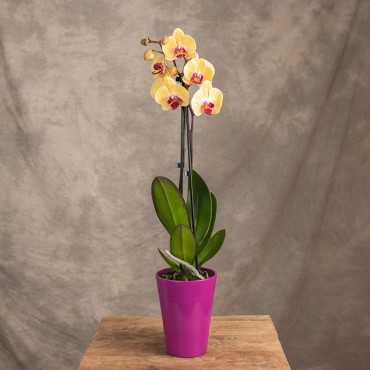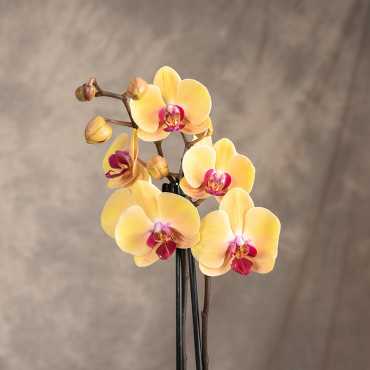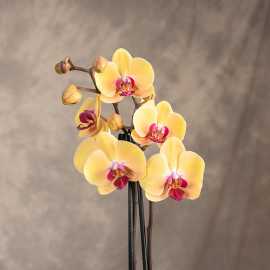 Niezwykle ozdobna odmiana popularnego storczyka, która wyróżnia się żółtym kolorem płatków z różowym środkiem.