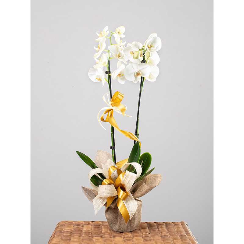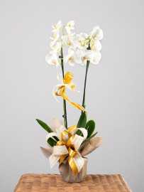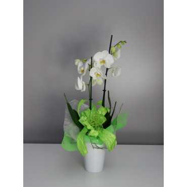 Storczyk Phalaenopsis udekorowany przez florystę. W zestawie osłonka ceramiczna. Oferujemy okazy wysokiej jakości z dużą ilością pięknych kwiatów i zdrowych pąków aby zapewnić długi czas kwitnienia. Ojczyzną Phalaenopsisa są Indie, Malezja, Filipiny i północna Australia.